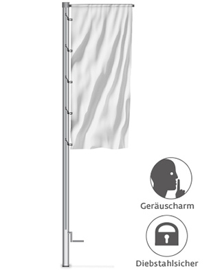 Der drehbar gelagerte Ausleger ist komfortabel hissbar. Dank innen verlaufender Seilführung ist das System geräuscharm und mit abschließbarer Bedientür sicher gegen Diebstahl abgesichert. Der formschöne Rotor ist am Mastkopf befestigt und vollkommen wartungsfrei. Das Auslegerrohr eignet sich für Fahnenbreiten von 100 und 160 cm und kann bei Bedarf abgenommen werden.