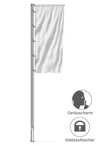 Der drehbar gelagerte Ausleger ist komfortabel hissbar. Dank innen verlaufender Seilführung ist das System geräuscharm und mit abschließbarer Bedientür sicher gegen Diebstahl abgesichert. Der formschöne Rotor ist am Mastkopf befestigt und vollkommen wartungsfrei. Das Auslegerrohr eignet sich für Fahnenbreiten von 100 und 160 cm und kann bei Bedarf abgenommen werden.