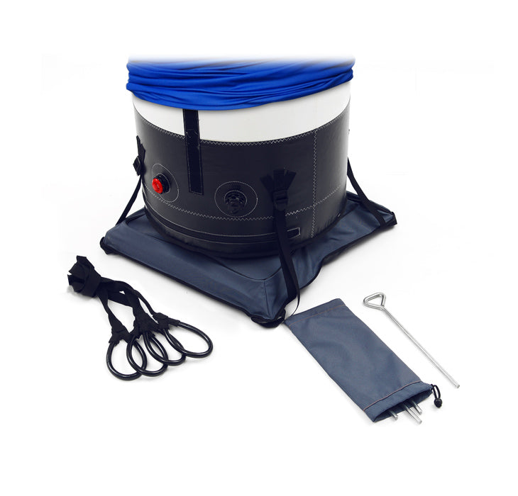 Der Untergrund sollte eine Wiese oder Kiesfläche sein – auf jeden Fall eine unversiegelte Fläche, um die sichere Befestigung des Airtube zu gewährleisten. Einmal fest verzurrt, hält sie, laut Hersteller, Windgeschwindigkeiten bis 70 km/h stand.
