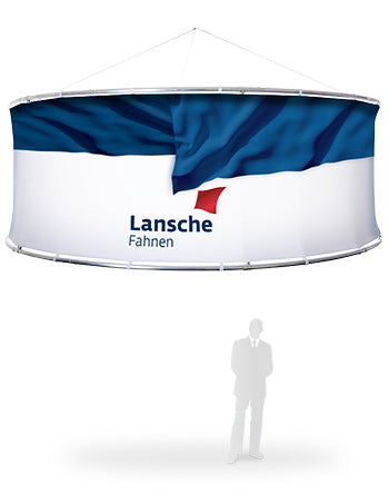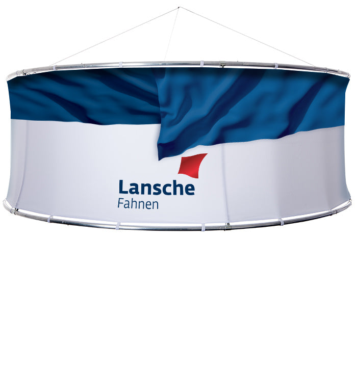Die runden Deckenhänger mit einem Durchmesser von 3,05 m lassen sich frei im Raum inszenieren. Allein die beeindruckende Größe in herausragender Höhe erregt die Aufmerksamkeit der Besucher. Nutzen Sie das textilbespannte Präsentationssystem als Werbebande, Leitsystem, Produkt- oder Imagewerbeträger. Der Deckenkranz bietet Platz für ein großformatiges Werbebanner mit den Maßen 9,45 m Breite x 1,00 m Höhe zur freien Gestaltung. Machen Sie auf sich aufmerksam mit der riesigen kreisrunden Werbefläche über den Köpfen Ihrer Kunden.