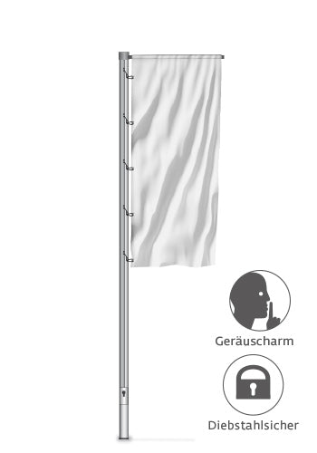 Zylindrisches Mastrohr mit Nut; abnehmbarer, hissbarer und drehbarer Teleskopausleger für Fahnenbreiten von 1,0 bis 1,5 m; sicher im Mastrohr verlaufende Perlon-Hissleine; Bediengehäuse mit abschließbarer Tür und selbsttätig arretierbarer Seilklampe; Fahnenschlingen und Fahnengewicht.