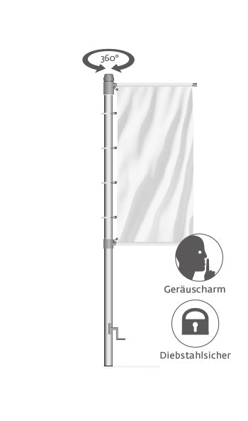 Ziehen Sie die Fahne oben und unten (Hohlsaum, mind. 3 cm) auf die drehbar gelagerten Auslegerarme, befestigen Sie nun die Fahnenschlingen am Mast und die Karabiner jeweils an den Rotoren. Mit Hilfe der abnehmbaren Kurbel hissen Sie die Fahne. Das Kurbel-Hisssystem ist abschließbar und nur mit Kurbel funktionstüchtig, sodass die Fahne bestens gegen Diebstahl geschützt ist.