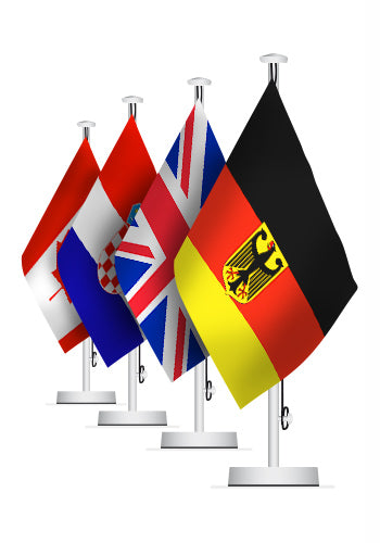 Die Miniaturausgaben der Nationalflaggen schmücken Konferenztische oder Feierlichkeiten. Auf anmutiger Kunstseide im Siebdruck-Durchdruck gedruckt, leuchten die Farben mit hoher Brillanz. Die kleinen Tischflaggen (Größe 0,15 x 0,25 Meter) stehen den großen Nationalflaggen in nichts nach. Zusammen mit unseren Tischständern kommen die Tischfahnen mit Perlonseil richtig zur Geltung. Bestellen Sie Ihre internationale Tischflagge einzeln oder komplett mit Tischständer. Drei Varianten stehen zur Auswahl (Höhe: 0,42 m):