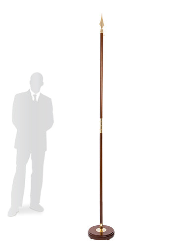 Der massive Holzfuß bietet hohe Standsicherheit. Die zweiteilige Holzstange mit einem Durchmesser von 32 mm steckt in einer Messinghalterung, die in den Holzfuß eingelassen ist. Ein Drehverschluss aus Messing verbindet die Holzstangen miteinander und sorgt dafür, dass auch bestickte, schwere Fahnen gehisst werden können.