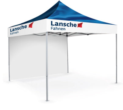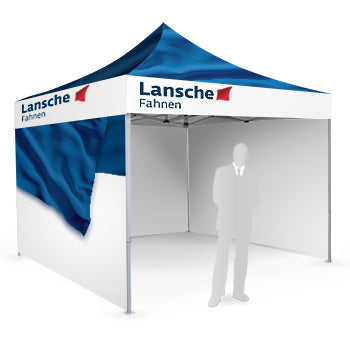 Die qualitativ hochwertigen Werbezelte von Lansche Fahnen begeistern durch das kleine Packmaß und den schnellen Aufbau vor Ort, ohne Werkzeug. Das 3 m x 3 m große Faltzelt schafft einen temporären Raum an jedem beliebigen Standort, bietet Schutz vor Sonne und Regen. Vollflächig bedruckt wird der Pavillon zum anziehenden Werbeträger, der bereits von weitem zum Informationsgespräch einlädt.