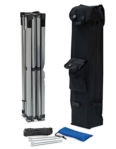 Die robuste Trage- und Transporttasche bietet Platz für das Aluminium-Gestell des Werbezeltes. In einer aufgenähten Tasche befinden sich Schnüre und vier Metallbodendübel zur sicheren Befestigung im weichen Untergrund. Zum Aufbau hat man somit vor Ort alles zur Hand. Nur die Dachplane sowie eventuell die Seitenwände werden gesondert aufbewahrt.